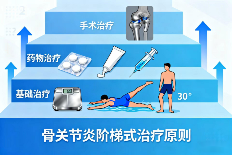骨关节炎的治疗是一个长期的、个性化的管理过程,目标在于缓解疼痛、改善功能、延缓疾病进展。其治疗遵循“阶梯式”原则。